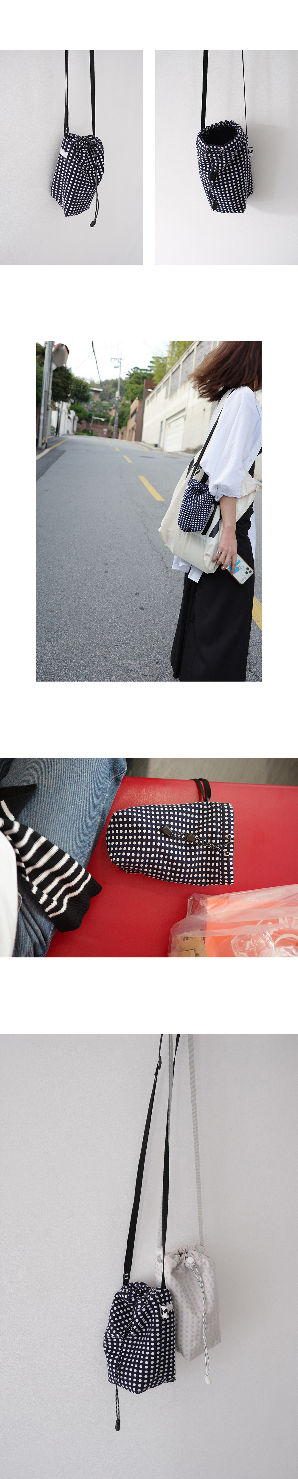 minmin의 베스트 제품인 미니백의 디자인을 이어받아 새로운 디자인으로 디벨롭하여 출시된 2 Pockets Mini Bag은 길이 조절이 가능한 스트랩으로 여름부터 겨울까지 사계절 내내 활용이 가능합니다. 액세서리 같은 포인트 역할을 해주는 도트 원단은 일상에 활력을 더해주며, 미니백의 장점이었던 뒷 포켓을 살려 실용적인 수납 또한 가능합니다. ♡︎