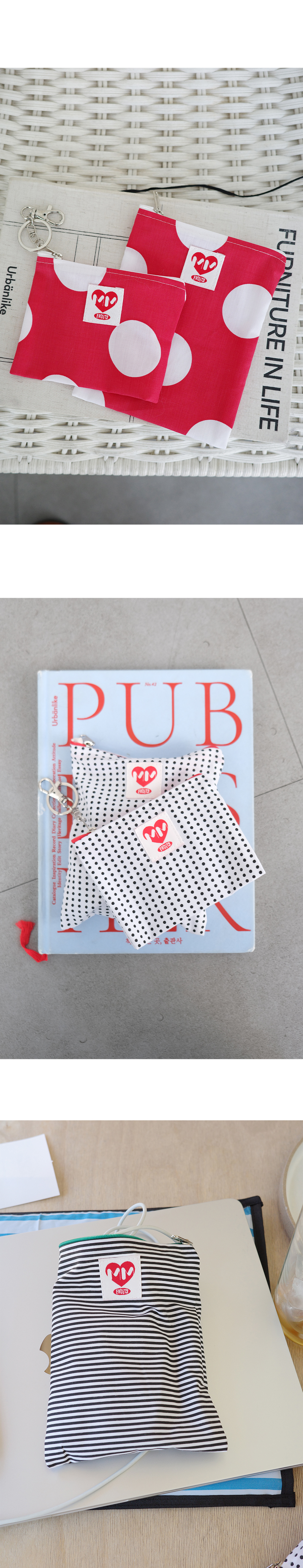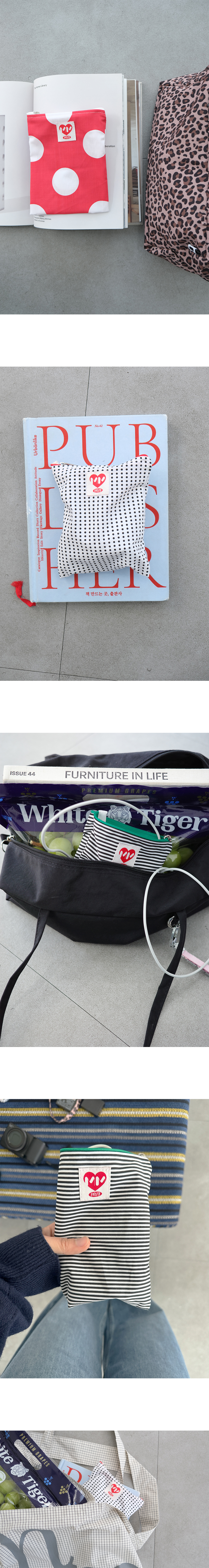 민민의 베스트 제품인 컬러 파우치와 동일한 크기의 패턴 파우치는 일상에서 유용하게 사용되는 크기입니다. 화장품, 각종 기기 배터리, 여성용품 등 자주 들고 다니는 소지품을 수납하며 포인트 패턴과 함께 일상에 리듬을 더해보세요!